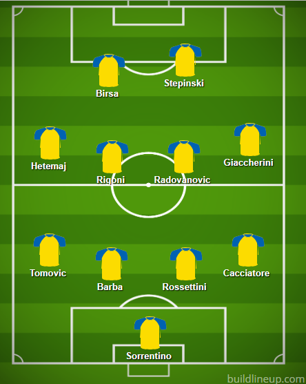 Sugli esterni di centrocampo, perchè numeri a parte, le ali avranno compiti di copertura, si candidano Hetemaj e Giaccherini, quest'ultimo al momento vittima di un fastidio fisico che lo ha escluso dall'ultima trasferta di Milano. Il finlandese verrà rispolverato tra i titolari, risolta la frattura alla costola rimediata a fine agosto; potrebbe anche prender posto in mezzo al campo, qualora Ventura volesse affiancare una punta a Stepinski, retrocedendo sulla fascia Birsa.Attenzione, però, anche alla candidatura del francese Leris, classe '98, che si è messo in luce in questo inizio di campionato, oltre a quella del tuttofare Depaoli, classe '97, che sulla destra può ricoprire posizioni su tutta la fascia. In mediana sarà Radovanovic il metronomo, coadiuvato da Nicola Rigoni. Pronto a dar manforte poi Obi, che in questa sosta per le Nazionali sta risolvendo un problema al ginocchio con apposite terapie.