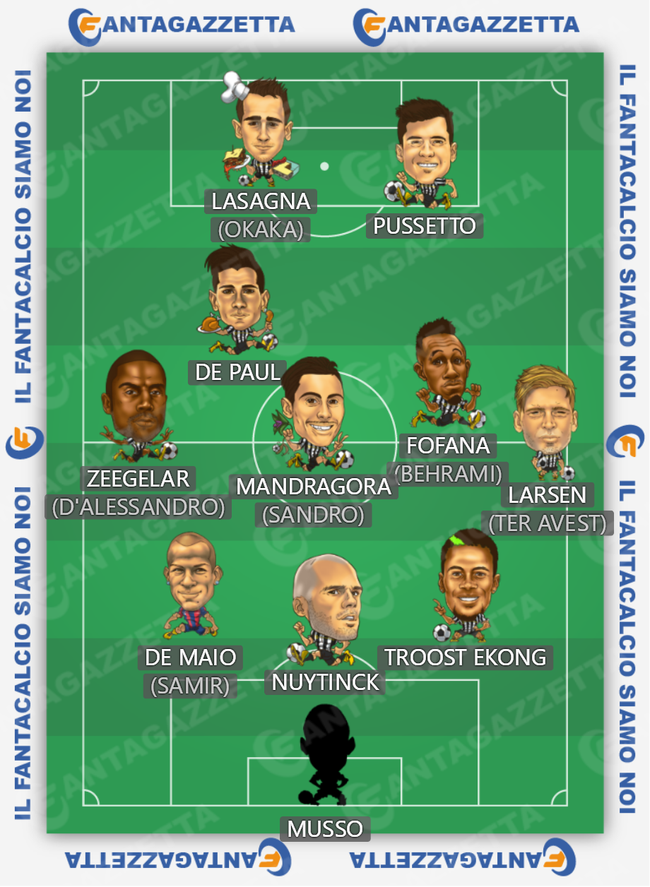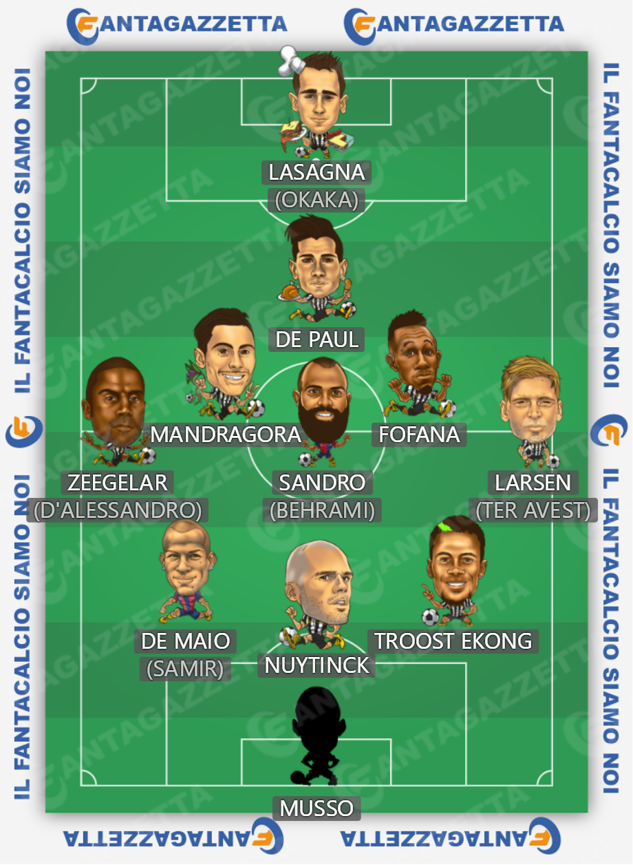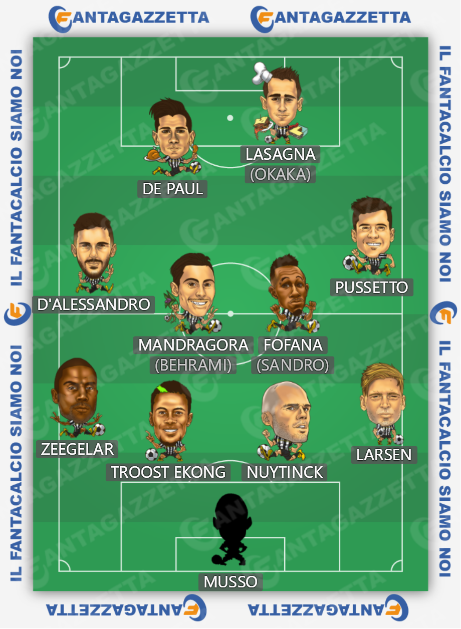 La novità del 4-4-2:In mezzo al campo potrebbero essere preferite la fisicità e la corsa di Mandragora e Fofana all'esperienza di Behrami e Sandro, che rimarrebbero comunque valide alternative. Esterni veloci ad attaccare gli spazi, ma anche a ripiegare: D'Alessandro, che sta ultimando il recupero dall'infortunio, potrebbe trovare posto a sinistra mentre sulla destra potrebbe essere proposto l'offensivo Pussetto. Tandem d'attacco composto da De Paul e Lasagna, quest'ultimo reduce dai gol contro Juve e Napoli che gli sono valsi la convocazione in Nazionale, ma pronto a subentrare ci sarebbe Okaka.
