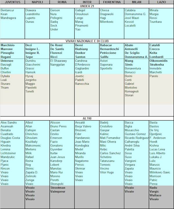 Per avere una visione chiara della situazione delle 7 big (Juventus, Roma, Lazio, Fiorentina, Napoli, Inter e Milan) ho preparato una tabella divisa in tre sezioni con i giocatori inseriti in ognuna di esse seguendo l’ordine alfabetico: