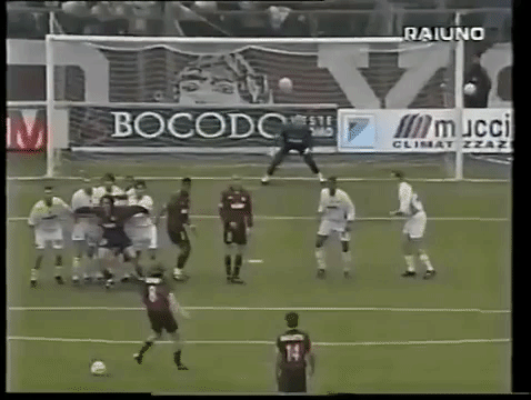 Mentre Serginho si divide fra rigori sul palo e partite da seconda punta al fianco di Pippo Inzaghi, Pirlo diventa rigorista dell'armata ancelottiana: 9 gol stagionali, 8 dagli undici metri (uno a Buffon vestito di rosa e un cucchiaio a Pagliuca). Qui sotto l'eccezione sul campo dell'Atalanta con un dentro-fuori che non inganna la terna e batte Taibi.