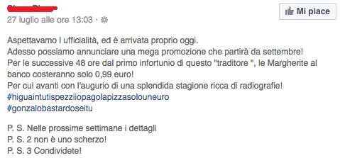 Sarebbe bello, però, avere una palla di cristallo che permetta di guardare in universi paralleli: come si comporterebbe l'irreprensibile Insigne, quello che, per sua stessa ammissione, in questo mondo ha Del Piero e non Maradona come idolo adolescenziale, se si ritrovasse ad essere oggetto della violenza verbale di un'intera tifoseria? Perché non è di sfottò che si sta parlando, perché non è coerente puntare (GIUSTAMENTE) il dito contro chi inneggia al Vesuvio o sbeffeggia con tono discriminatorio Napoli e poi rispondere con moneta dello stesso (bassissimo) valore. Se si vuole continuare a fare i finti tonti, si faccia pure, ma il Magnifico come reagirebbe dopo un gol contro una squadra la cui tifoseria sarebbe pronta a regalare pizze al "primo infortunio di questo traditore"?