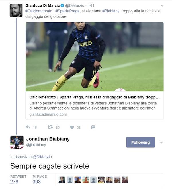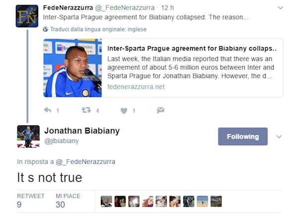 Si apre un nuovo caso, in casa Inter, e riguarda uno degli esuberi messo sul mercato da Sabatini. Ovvero, quel Jonathan Biabiany che sembrava aver trovato un accordo ormai definitivo con lo Sparta Praga, e che invece poi ha rifiutato la destinazione, dove lo aspettava a braccia aperte uno che lo conosce bene come Andrea Stramaccioni. Il motivo? Forse per via del suo ingaggio, ritenuto troppo elevato da parte del club ceco. Un'indicazione che in ogni caso è stata smentita seccamente, ed anche in maniera originale, dal diretto interessato tramite twitter, che rivolgendosi a Di Marzio ha commentato, laconico: "Sempre cagate scrivete", per poi ribadire, ad un altro link riportante la notizia, "It's not true". Dove starà la verità?