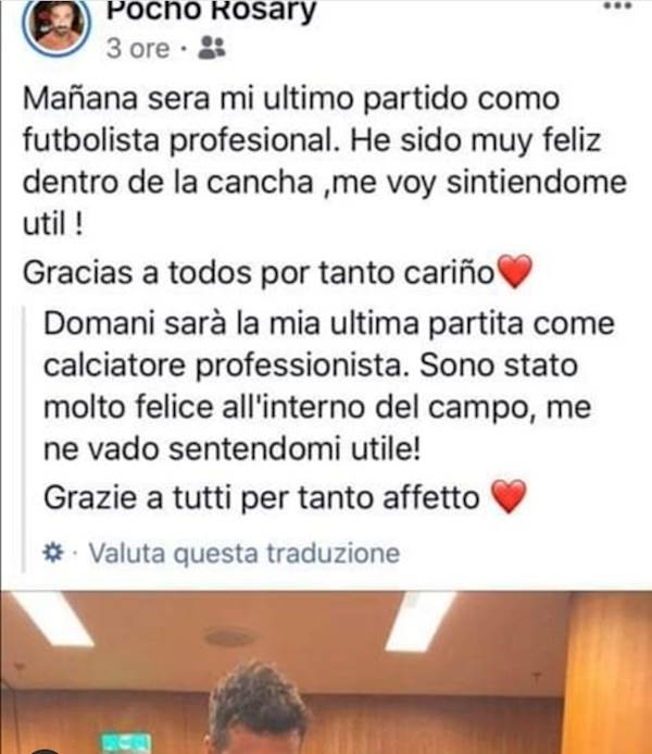 ?"Domani sarà la mia ultima partita come calciatore professionista. Sono stato molto felice all'interno del campo, me ne vado sentendomi utile! Grazie a tutti per tanto affetto".