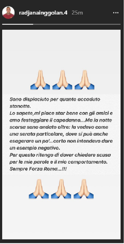 Dopo il video quanto meno discutibile che ha fatto il giro del web, Radja Nainggolan si è voluto scusare con un'altra storia di Instagram. Questo il messaggio del centrocampista belga della Roma: "Sono dispiaciuto per quanto accaduto stanotte. Lo sapete, mi piace star bene con gli amici e amo festeggiare il capodanno... Ma la notte scorsa sono andato oltre: la vedevo come una serata particolare, dove si può anche esagerare un po'... certo non intendevo dare un esempio negativo. Per questo ritengo di dover chiedere scusa per le mie parole e il mio comportamento. Sempre forza Roma...!!!".