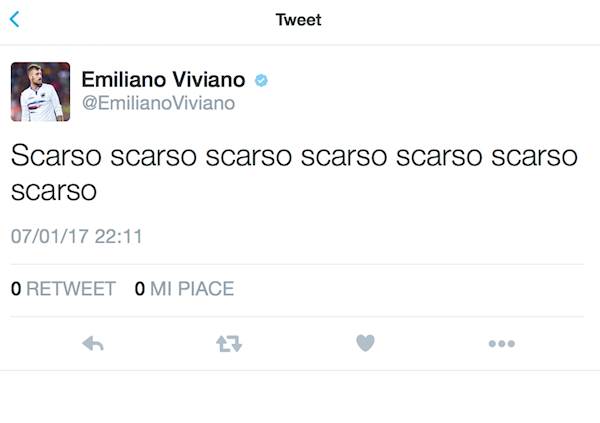 "Scarso scarso scarso scarso..." twitta il portiere blucerchiato, probabilmente non condividendo la decisione di Di Bello. Tweet prontamente rimosso, ma a danno ormai fatto.