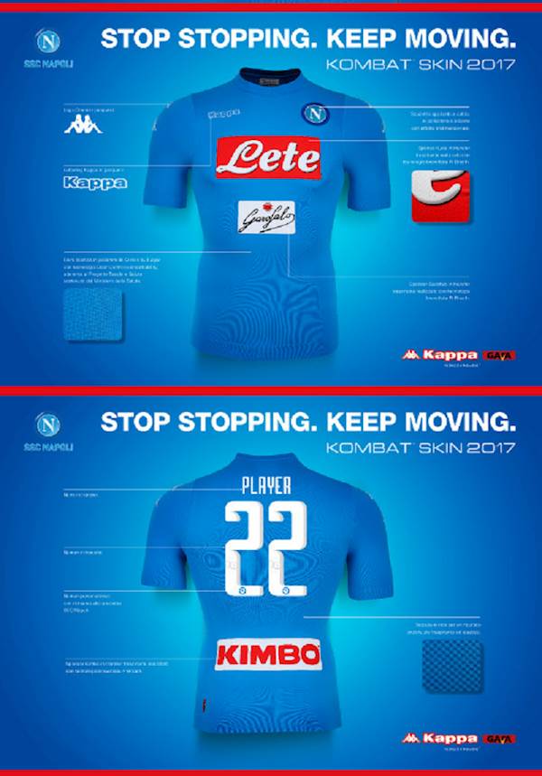 Sul sito ufficiale azzurro riportati i dettagli della maglia: "la Kombat™ Skin 2017 del SSC NAPOLI vuole rendere la partita più spettacolare. È stata progettata dal Centro Ricerca e Sviluppo Kappa con la SSC Napoli per definire nuovi standard prestazionali e incoraggiare nuove abitudini di gioco. Il principio tecnico Stop Stopping(funzione antitrattenuta) si integra e rafforza con la tecnologia Seamless(senza cuciture), per il massimo comfort sulla pelle, e le proprietàUntenable del tessuto, che rendono impossibile aggrapparsi alla maglia.