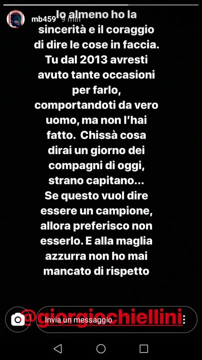 Anche in questo caso caso, come spesso accade, Balotelli non ha fatto giri di parole ed è andato dritto al punto: "Io almeno ho la sincerità e il coraggio di dire le cose in faccia. Tu dal 2013 avresti avuto tante occasioni per farlo, comportandoti da vero uomo, ma non l'hai fatto. Chissà cosa dirai un giorno dei compagni di oggi, strano capitano...Se questo vuol dire essere un campione, allora preferisco non esserlo. E alla maglia azzurra non ho mai mancato di rispetto".