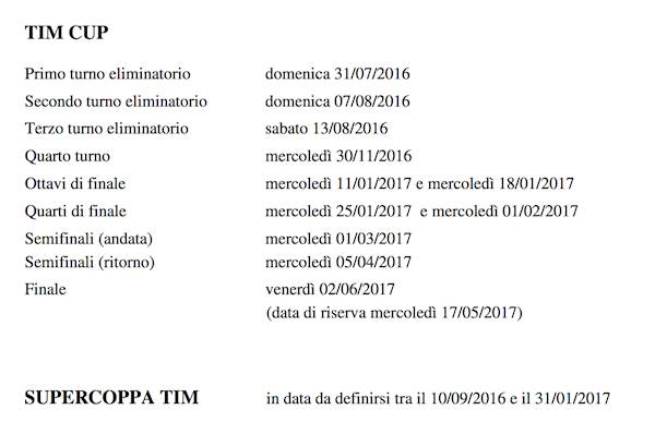 La stagione è appena finita, ma la voglia di ricominciare è già tanta. Il campionato di Serie A 2016/17 avrà inizio il 21 agosto: lo ha ufficializzato la Lega Calcio con un comunicato ufficiale, che rende note tutte le date della prossima stagione. Il campionato inizierà ad agosto e avrà termine il 28 maggio 2017, mentre la Coppa Italia comincerà con il primo turno eliminatorio il 31 luglio. Ancora da stabilire la data della Supercoppa, che sarà disputata tra il 10 settembre 2016 e il 31 gennaio 2017