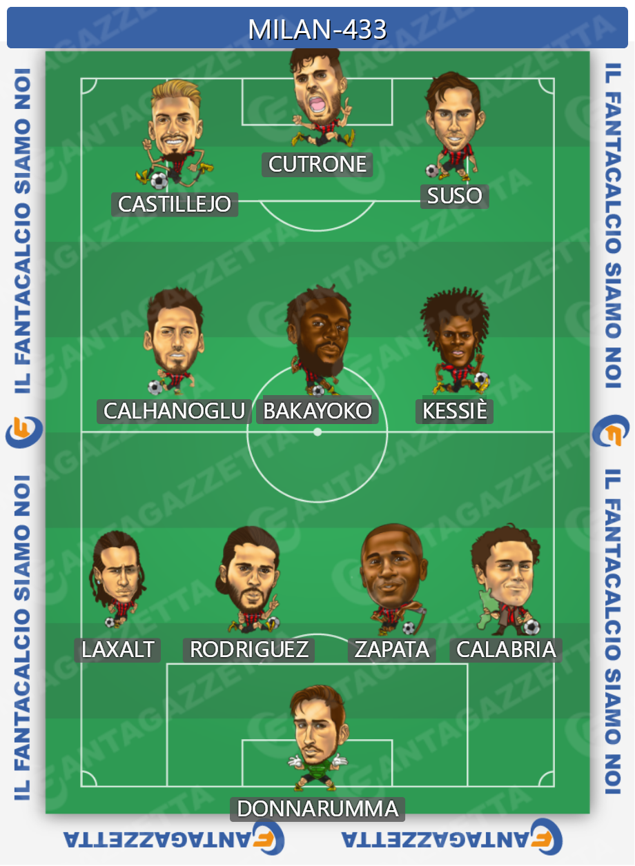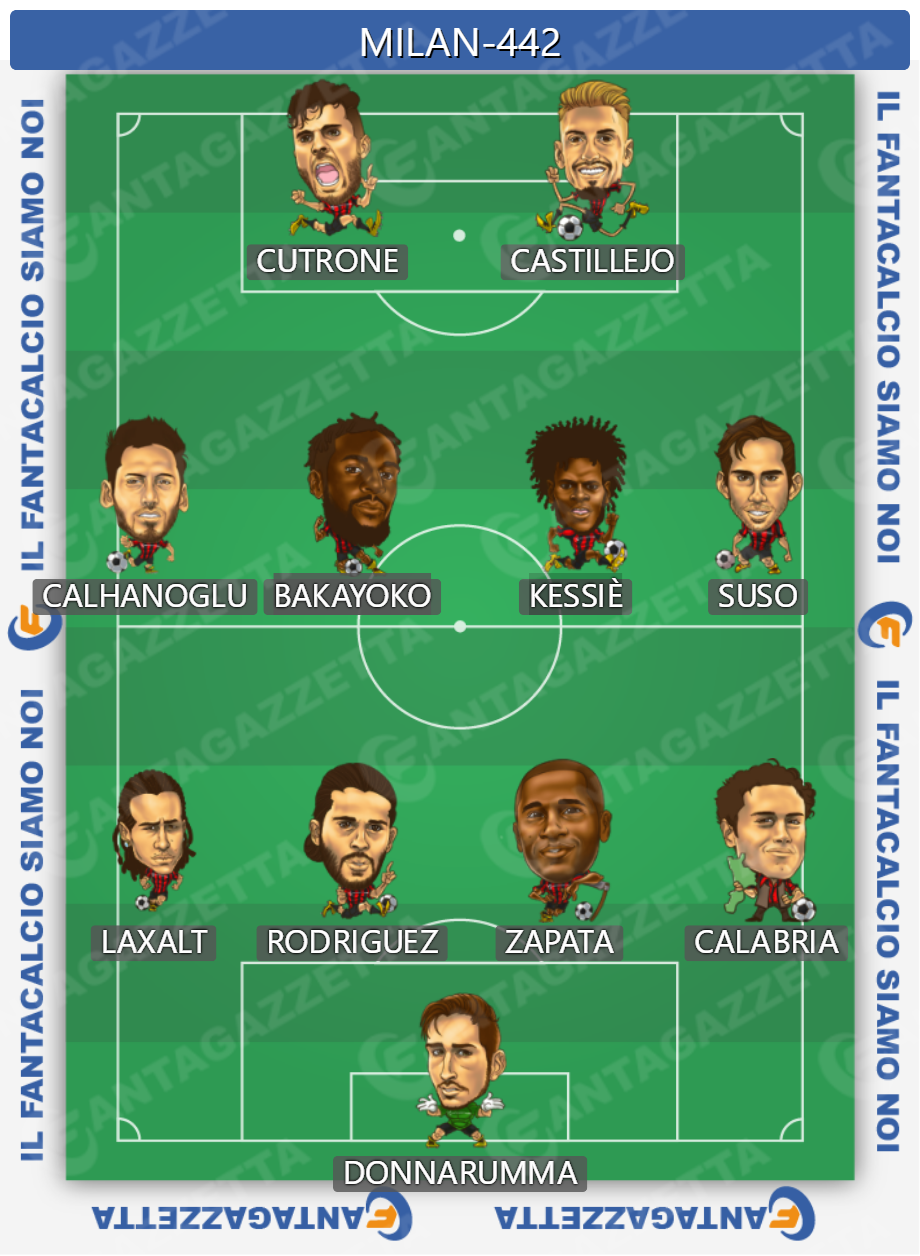 Qualora Gattuso decida di continuare con il 4-4-2, partirebbe dal 1' Castillejo al fianco di Cutrone e andrebbe in panchina uno tra Abate e Calabria. Suso e Calhanoglu sarebbero gli esterni in questo caso con Kessiè e Bakayoko e fare da diga. Un rischio, come scritto, è rappresentato dallo schierare coppia centrale Zapata e Rodriguez.