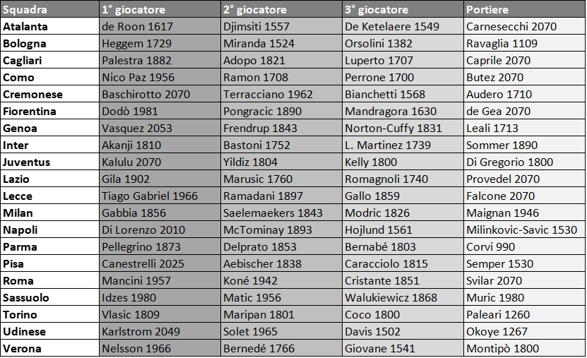 Per avere una visuale immediata della situazione, nella tabella sottostante sono stati inseriti per ogni squadra i tre giocatori di movimento più impiegati in campionato (con di fianco il numero di minuti giocati) e nell’ultima colonna il portiere più utilizzato. Si è scelto di separare i portieri dai giocatori di movimento perché la probabilità che l’estremo difensore titolare non salti una partita è molto più elevata rispetto a quanto può capitare a un calciatore di qualsiasi altro ruolo. Per omogeneità non sono conteggiati i minuti giocati nell'anticipo di ieri fra Verona e Pisa.