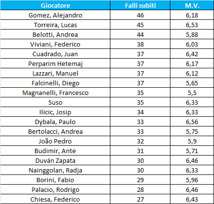 Questa la tabella relativa alla Top 20 dei giocatori che hanno subito più falli fornitaci da Opta, completata dalla Media Voto di ognuno (MV basata sui voti della redazione di Napoli):
