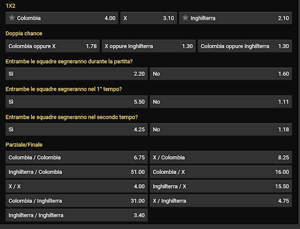 Due delle nostre outsider favorite per la conquista del titolo si incrociano nell’ultimo ottavo del Mondiale. La Colombia ha vinto il proprio girone con il successo in extremis sul Senegal; mentre l’Inghilterra è arrivata seconda nel gruppo H perdendo la sfida tra le riserve con il Belgio. Una sfida che si preannuncia molto equilibrata. I cafeteros hanno dimostrato buona solidità difensiva grazie anche all’exploit di Mina, mentre gli inglesi hanno in Harry Kane il proprio punto di forza. Chi vince sfiderà una tra Svezia e Svizzera avendo così una ghiotta opportunità di arrivare tra le prime 4 del Mondiali.