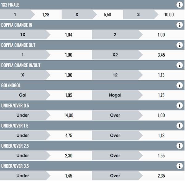 IL NOSTRO PRONOSTICO: con l'entusiasmo a mille il Milan di Gattuso si prepara a riconquistare definitivamente San Siro in un match apparentemente agevole che non ammette altri risultati che la vittoria. Contro il Chievo di D'Anna l'impressione è che manchi solo il colpo del ko per far partire in casa clivense una rivoluzione obbligata al fine di correggere l'attuale stagione prima che sia troppo tardi. Non possiamo, quindi, andare oltre il segno 1 @1.28 per la nostra #ICE. Per la #FIRE puntiamo sui gol, anche alla luce delle ultime uscite rossonere e delle rispettive difese tutt'altro che impenetrabili, con l'Over 3.5 @2.35.