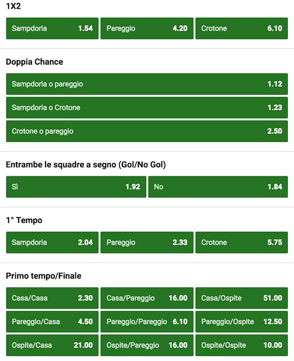IL NOSTRO PRONOSTICO: come anticipato la passata stagione vi fu il colpo gobbo degli ospiti per 2-1 sul campo del Doria. Nella giornata odierna, tuttavia, siamo sempre più convinti che le ambizioni e l'attuale ottimo momento di forma dei padroni di casa possano avere il sopravvento e puntiamo sul segno 1 @1.54 in ottica #ICE. Per ciò che concerne la #FIRE, anche considerando che i crotonesi giocheranno a testa bassa provando, non avendo nulla da perdere, in tutti i modi a dar fastidio all'undici di Giampaolo, azzardiamo una quota super con l'Over 3.5 @3.25.