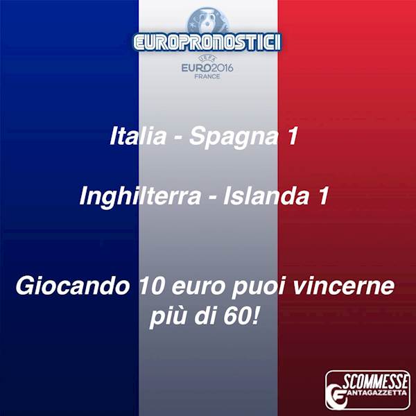 Inghilterra - Islanda (21.00, 27 giugno, Nizza)Hodgson al termine di questa manifestazione avrà gloria eterna o forzato allontanamento dal calcio che conta. Se c'è una nazionale che vive il torneo come ultima spiaggia di un rilancio culturale e sportivo questa è l'Inghilterra. Dinanzi trovano una favola del torneo, l'Islanda prima del suo girone con un popolo alle spalle che aspettava questo momento da sempre e con più di un prospetto interessante in rosa, come mai si era trovata. Puntiamo sugli inglesi, pur non disdegnando la quota dell'over 2.5 prevedendo almeno un gol degli islandesi.