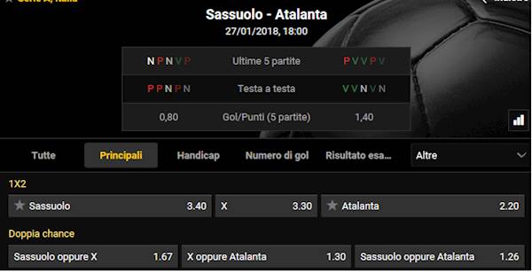 IL NOSTRO PRONOSTICO: il Sassuolo potrebbe far risultato, nonostante i recenti precedenti siano tutti a favore degli orobici (comprese le due gare stagionali tra campionato e Coppa Italia). Pertanto optiamo per la generosa doppia chance interna offerta @1.67 da Bwin. Come pronostico #FIRE ci affidiamo ad una quota abbastanza singolare, ossia Sassuolo segna 1 pt @3.10.
