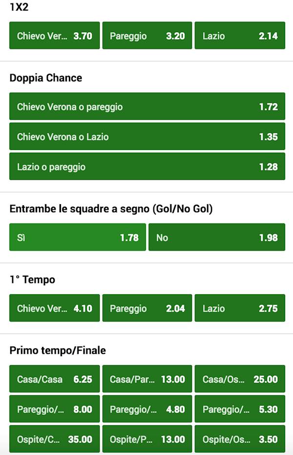 PRECEDENTI: dal 2002, anno in cui il Chievo fece il proprio esordio in Serie A, tra i clivensi e i biancocelesti sono stati disputati 15 incontri. In 2 occasioni si sono imposti i padroni di casa, 5 sono stati i pareggi e 8 le vittorie ospiti. I gol non sono il forte di queste sfide ma al contrario di quanto si possa immaginare, i segni Over sono più frequenti degli Under. Nelle ultime tre sfide, due pari e una vittoria clivense, le quali hanno interrotto il filotto di 7 vittorie consecutive della Lazio dal 2006 al 2014.
